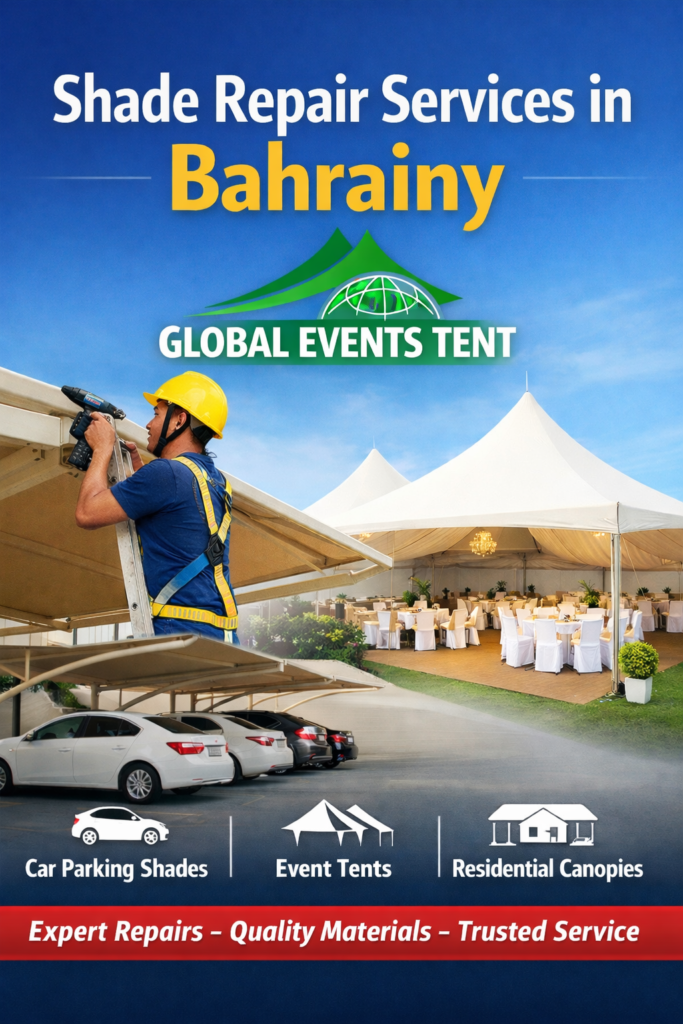 Maintaining the durability and appearance of shades, canopies, and tents in Bahrain requires expert care, high-quality materials, and timely repairs. Global Events Tent offers comprehensive shade repair services that address all types of damage, from torn fabrics and bent frames to loose fittings and weakened supports. With skilled technicians, premium UV-resistant materials, and specialized solutions for car parking shades, event tents, and residential canopies, every repair is performed to ensure long-lasting functionality and safety.